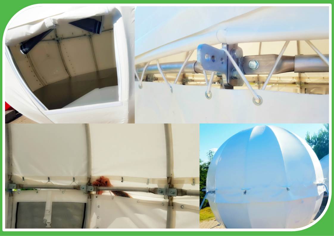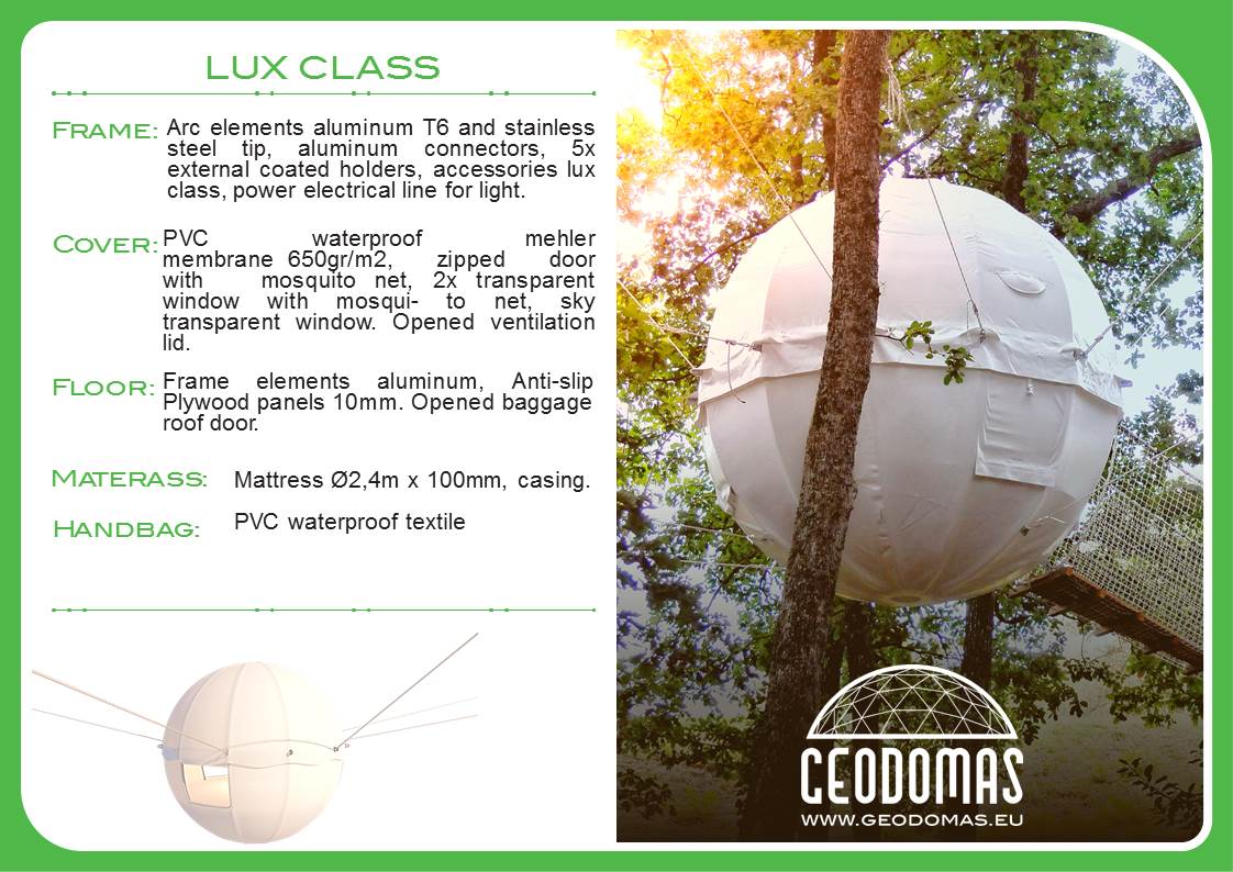 Medžiuose įrengta trijų metrų pločio aliuminio konstrukcijos sfera padengta vėjui ir lietui atspariu audiniu, tai COCOON palapinė. Arti nėra medžių, ne bėda, palapinę įsirengsite ant specialiai sukurto rėmo.