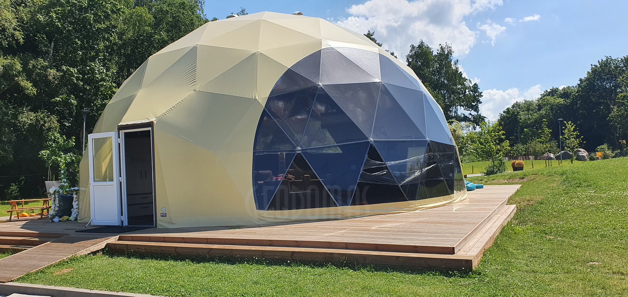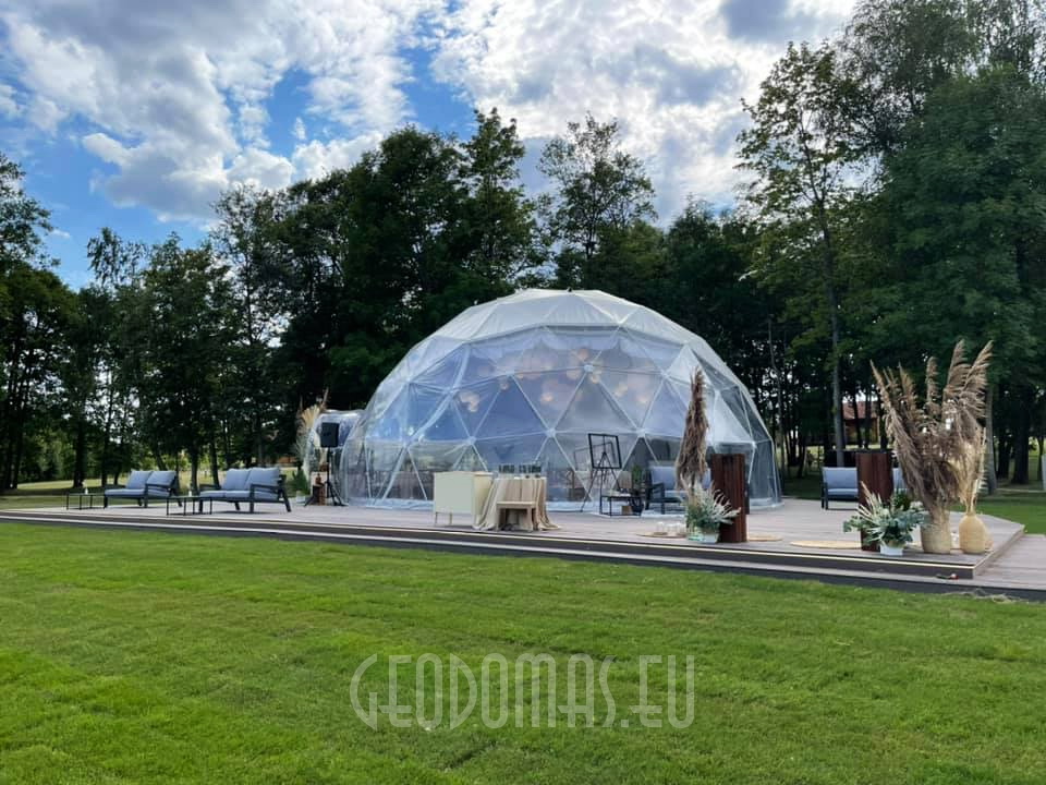 Panoraminė PVC lango membrana tonuota, skirta naudoti „Glamping“ tentui. Skaidrus PVC audinys, puikiai praleidžiantis saulės šviesą ir apšviečiantis visą kupolą..