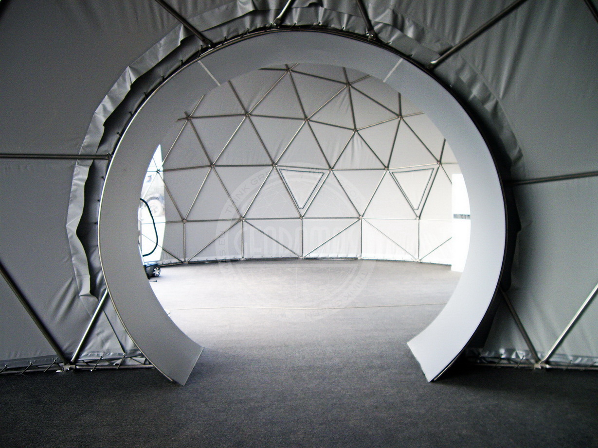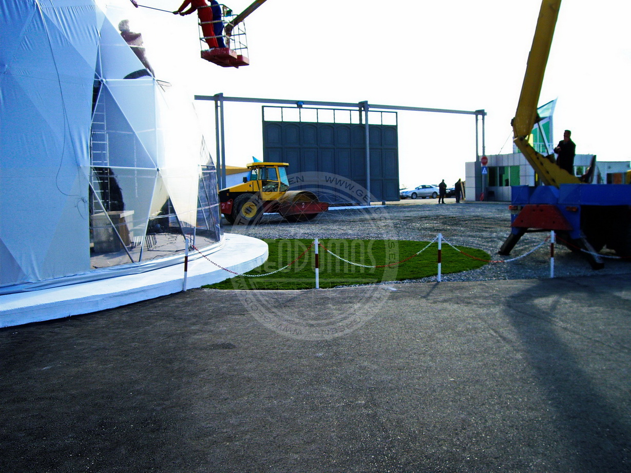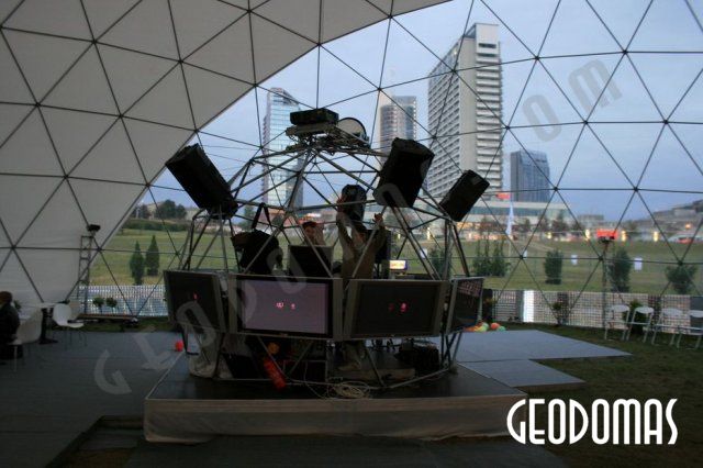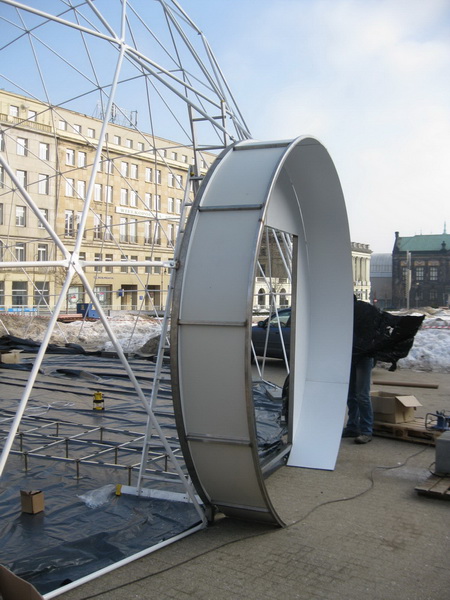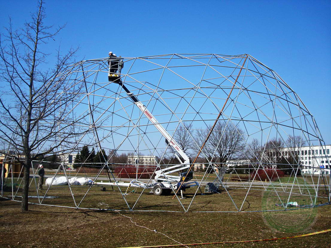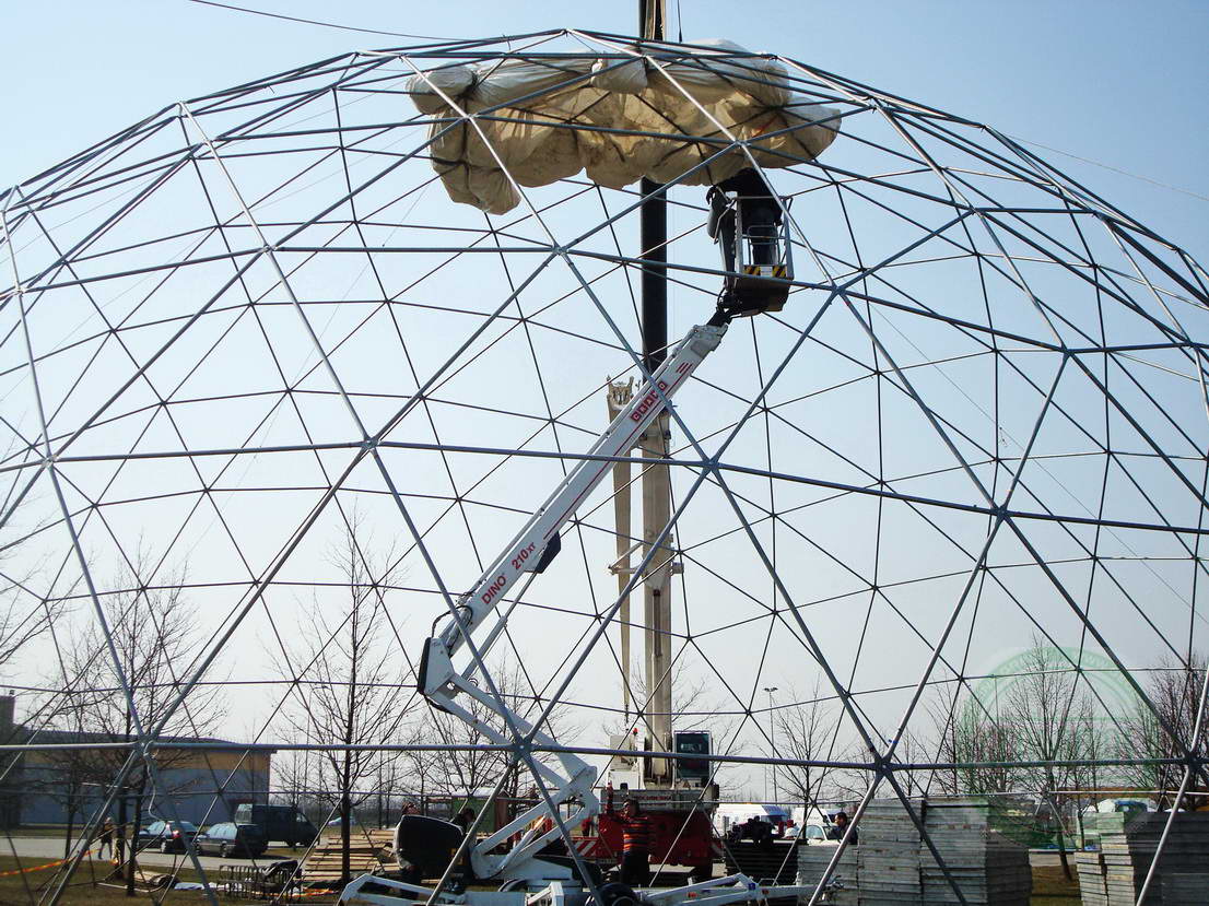 Metalinė, cinkuota sferinės formos konstrukcija | Kupolo formos paviljono rėmas pagamintas iš cinkuoto plieno, vieno varžto jungtys, apatinės jungtys kupolo tvirtinimui.