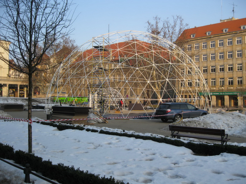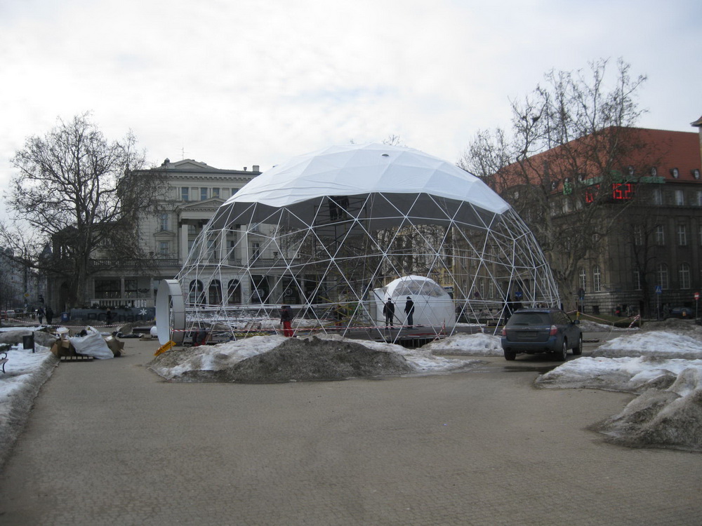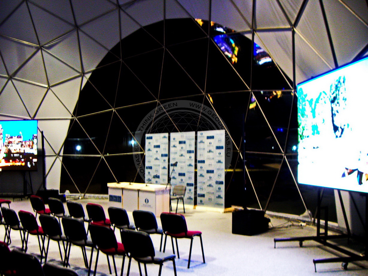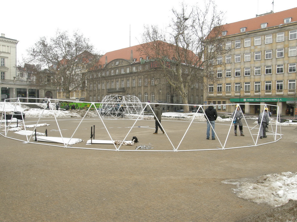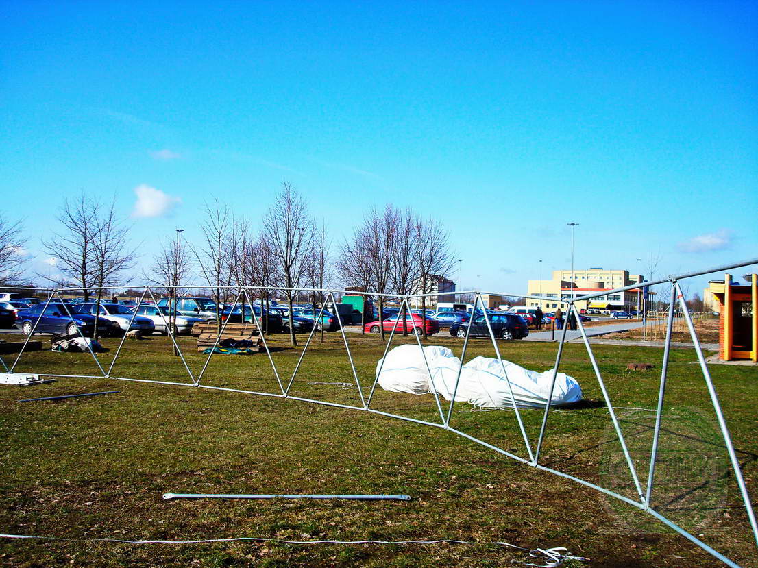 Metalinė, cinkuota sferinės formos konstrukcija | Kupolo formos paviljono rėmas pagamintas iš cinkuoto plieno, vieno varžto jungtys, apatinės jungtys kupolo tvirtinimui.