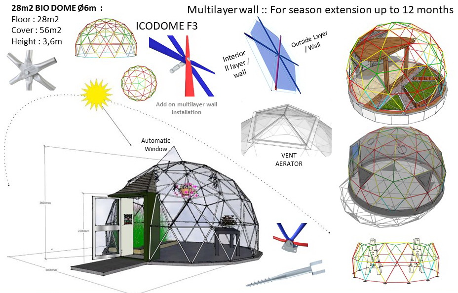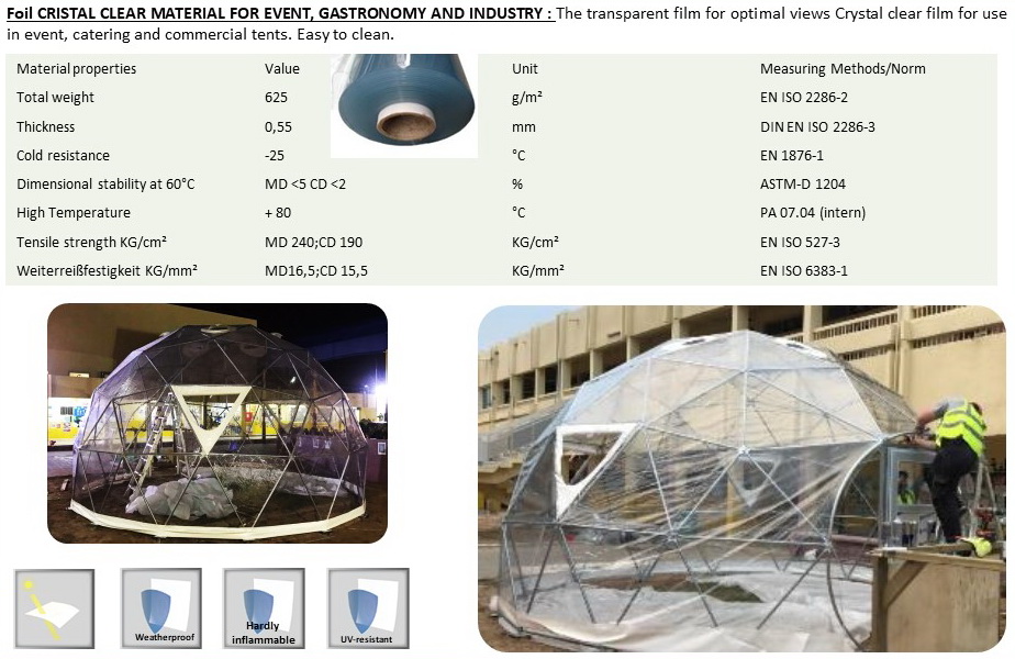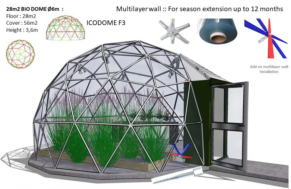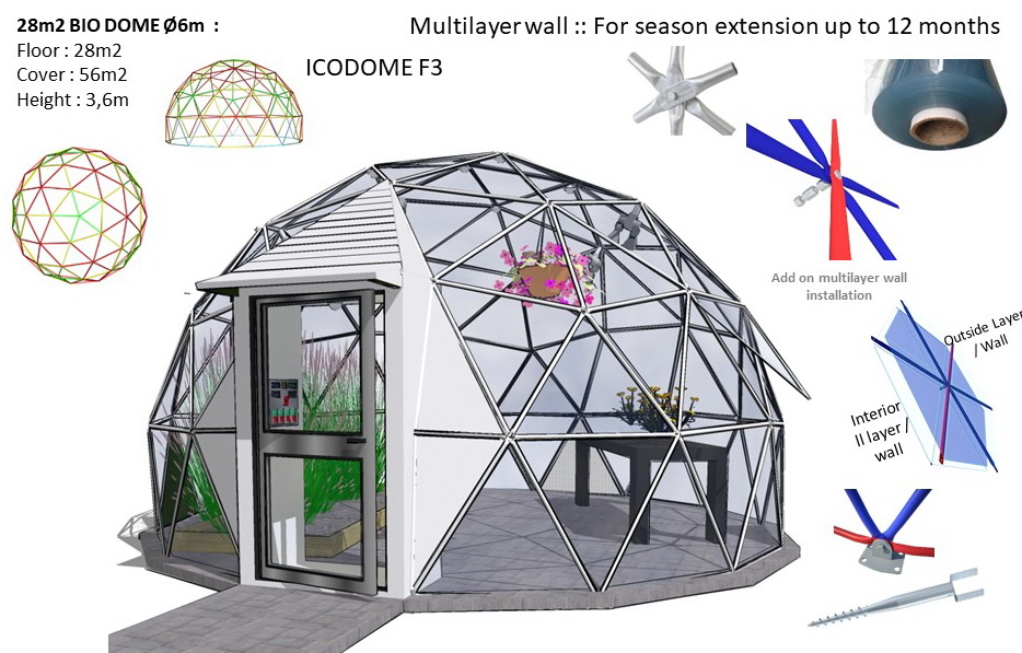 Įtempimo daugiasluoksnė vidaus siena sukuria 15 cm oro kamerą. Ši technologija leidžia izoliuoti jūsų kupolą. Oro erdvė nuolat vėdinama natūralios ventiliacijos srautais. Daugiasluoksnė siena pratęs kupolo sezoną visiems metams. 100% poliesteris su PVC uždangalu, Ypač neplyšantis / tvirtas, atsparus vandeniui, plyšimui sunkusis PVC tentas.