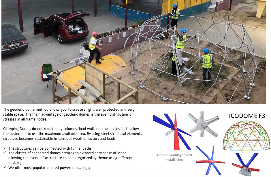 Geodezinio kupolo metodas leidžia sukurti lengvą, gerai apsaugotą ir labai stabilią erdvę. Pagrindinis geodezinių kupolų privalumas yra tolygus įtempių pasiskirstymas visuose rėmo mazguose. „Glamping Domes“ nereikia jokių kolonų, apkrovos sienų ar stulpelių, kad klientai galėtų naudotis maksimaliu turimu plotu. Naudojant plieninius konstrukcinius elementus, struktūra tampa tvari atsižvelgiant į oro veiksnius ir apkrovas.