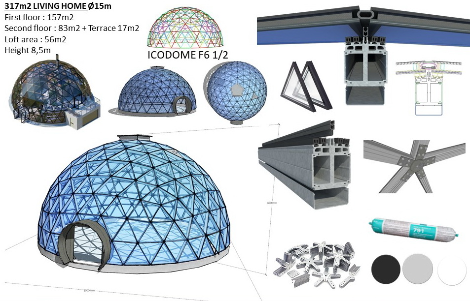 - Aliuminio konstrukcinis rėmas ir dengto plieno kupolo jungtys. Montavimo rinkinys: Tarpinės dalys, varžtai, tvirtinimo elementai, visų elementų žymėjimas ir pakuotė.