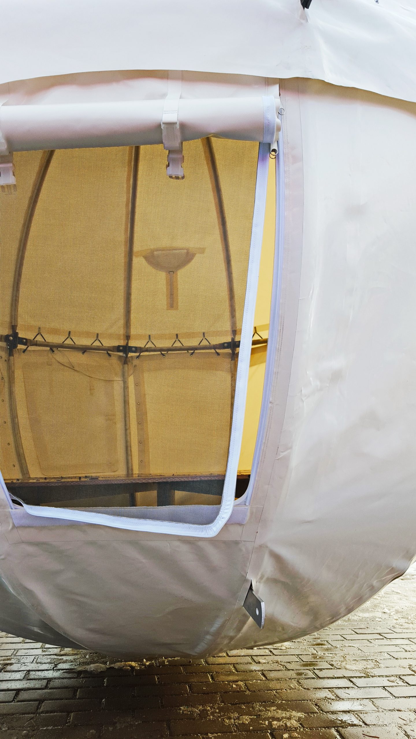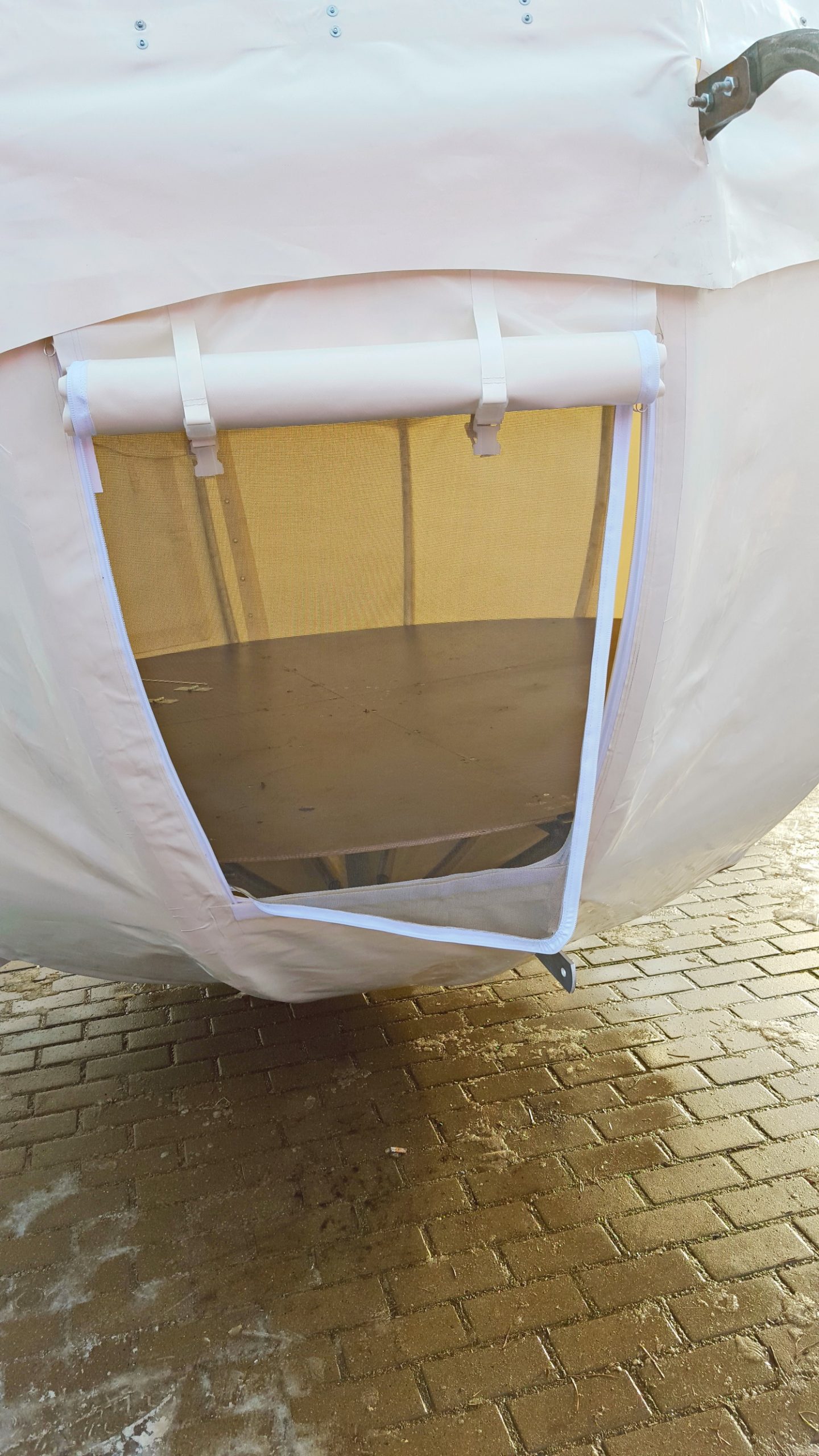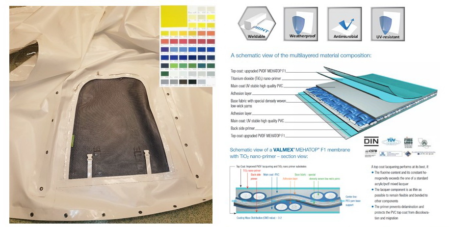 - DANGA: PVC danga 720-900gr / m2 (spalva: tamsiai žalia), 30% paviršiaus PVC skaidrus tamsintas langas 625g / m2 , atsparus UV . Rakinamos durys su užtrauktukais, tinklelis nuo uodų.