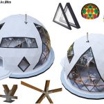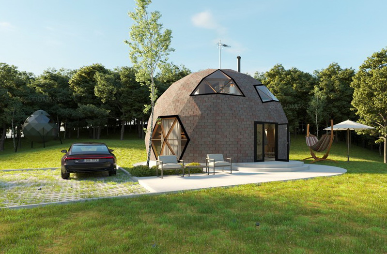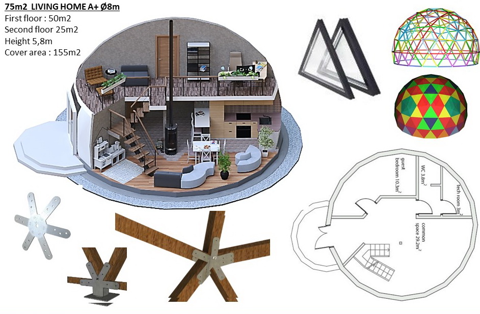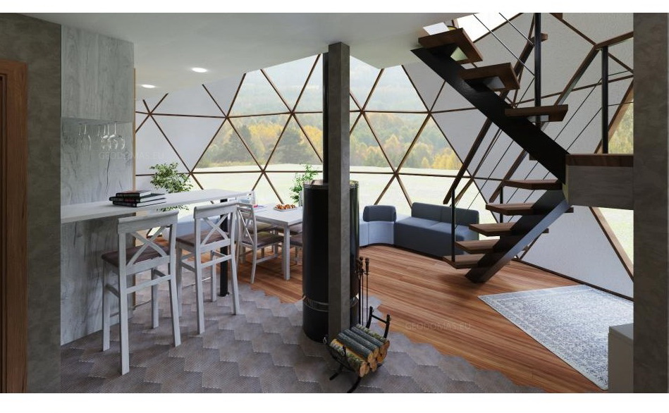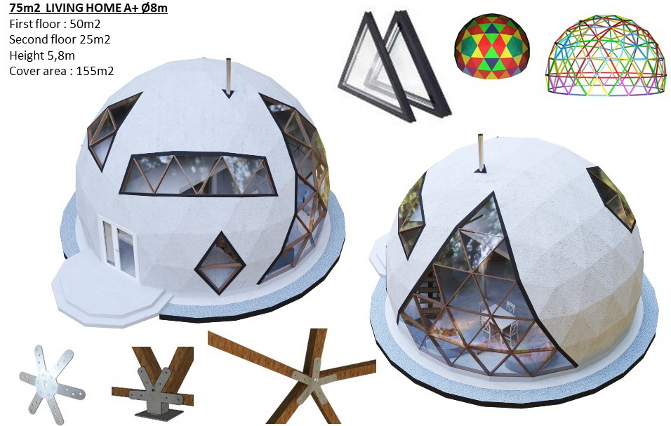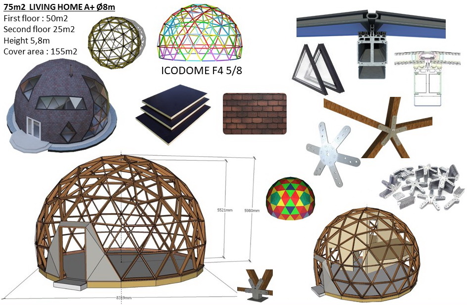 Trikampės formos plokštės, fasado plokštės COSMO PLOKŠTĖS : 25mm (pagrindinis variantas), PVC-XPS-PVC plokščių struktūra. Tvirtinimo elementai plokštėms su tarpine. Montavimo klijų rinkinys sandariklių apdorojimui. Baltas fasado sandariklis-klijai apdailos ir dekoratyviniams darbams. Skardinė perimetro palangė pamatų hidroizoliacijai. Gravitacinė vėdinimo sistema apatiniame kupolo perimetre. Pilnas montavimo komplektas ir fasado surinkimo dokumentacija.