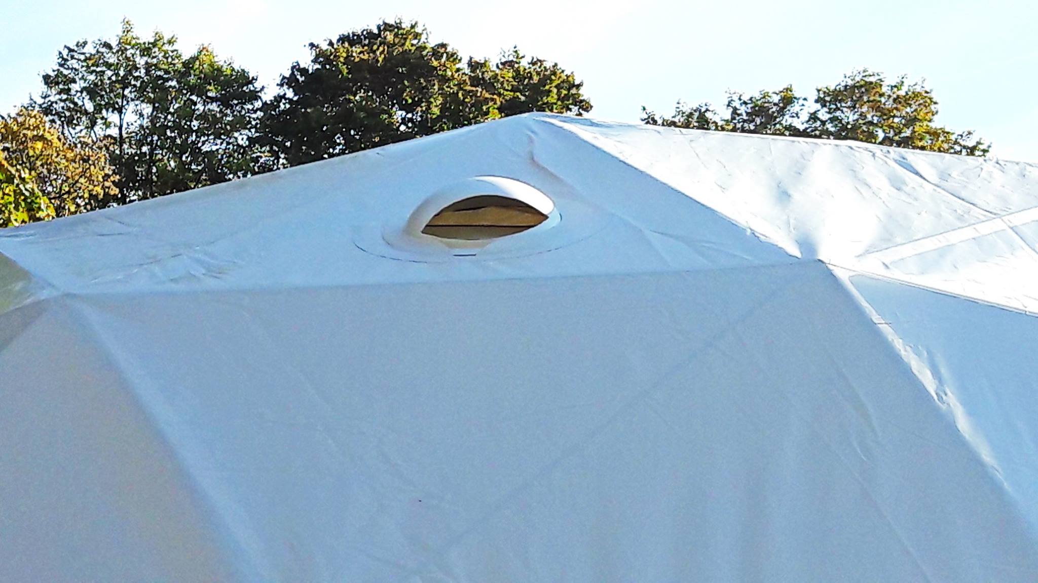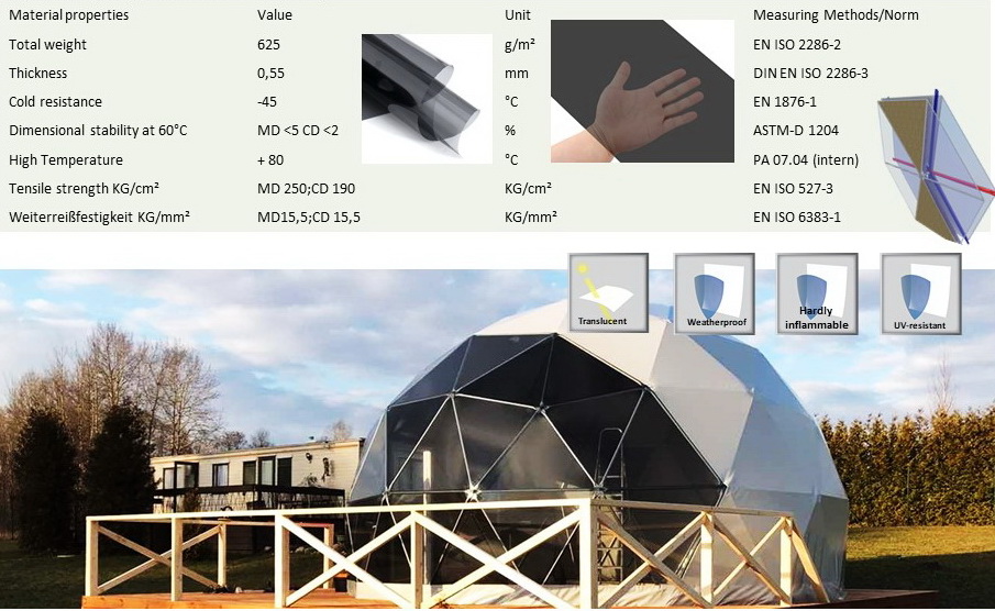 Panoraminė PVC lango membrana tonuota, skirta naudoti „Glamping“ tentui. Skaidrus PVC audinys, puikiai praleidžiantis saulės šviesą ir apšviečiantis visą kupolą..