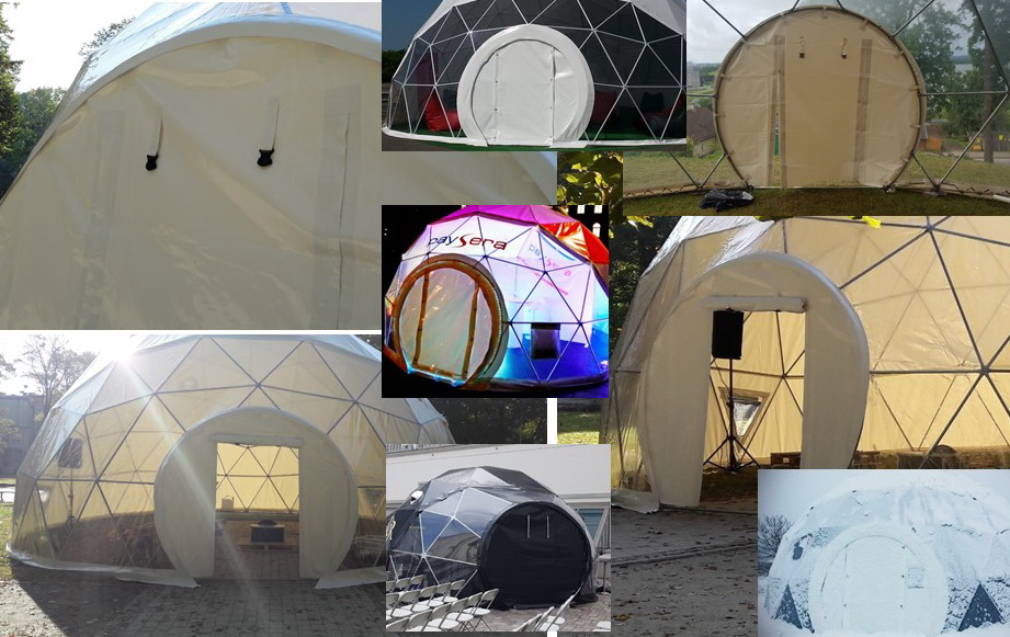 Geodeziniams kupolų uždangalams naudojame aukščiausios kokybės PVC tentų audinius. Visi mūsų audiniai yra sertifikuoti ir atitinka Europos kokybės ir atsparumo ugniai standartus. Nuimama kupolo danga yra žinoma dėl savo privalumų ir ilgo tarnavimo laiko. Dėl dažno audimo medžiaga yra atspari pradūrimams, įbrėžimams ir įpjovimams. Labai lengva išlaikyti kupolo uždangalus švarius. Patvarūs “GEODOMAS” uždangalai yra įvairių spalvų, atsparūs pelėsiui ir apsaugoti nuo UV spindulių ir atsparūs ugniai. Visi audiniai turi ugniai atsparius sertifikatus NFP 92507: M2; DIN 4102: B1; EN 13501-1: B-s2-d0, BS 7837.