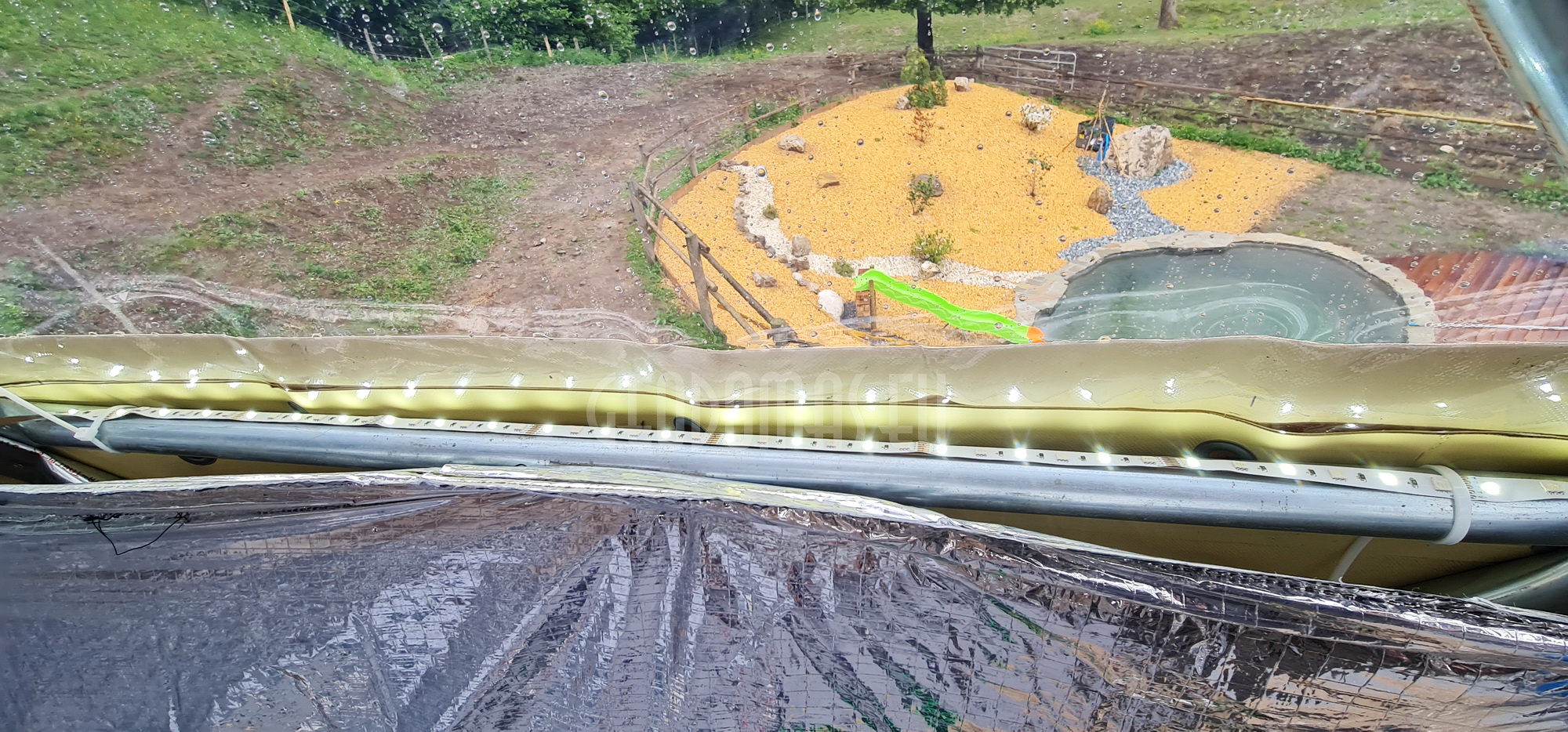 COVER: 60% ploto, PVC danga 720-900gr / m2 (spalva: tamsiai žalia), 30% paviršiaus PVC skaidrus tamsintas langas 625g / m2 , atsparus UV. Rakinamos durys su užtrauktukais, tinklelis nuo uodų.