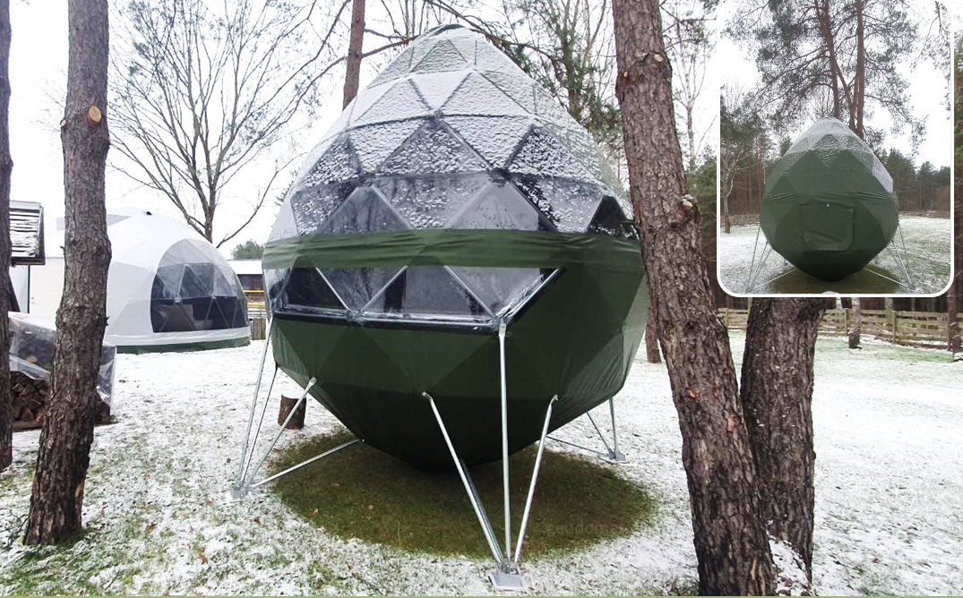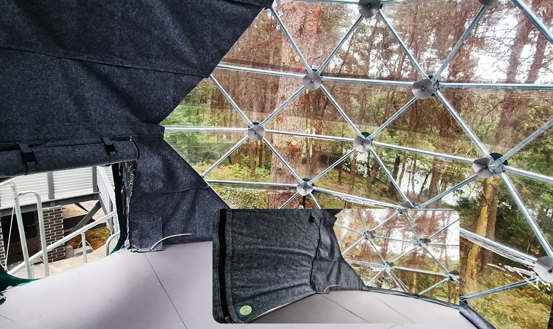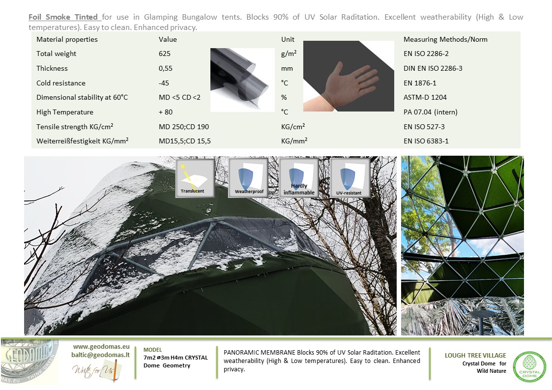Panoraminė PVC lango membrana tonuota, skirta naudoti „Glamping“ tentui. Skaidrus PVC audinys, puikiai praleidžiantis saulės šviesą ir apšviečiantis visą kupolą..
